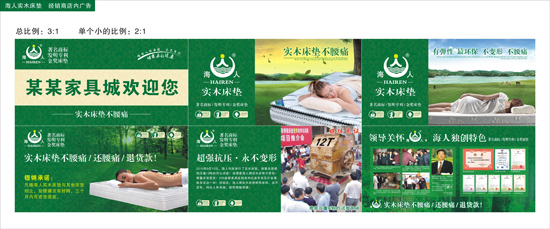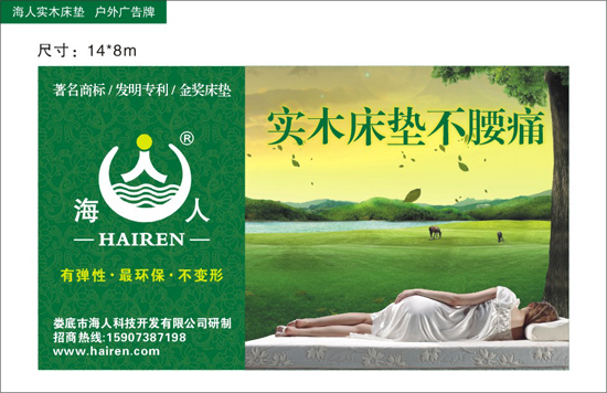 公司LOGO描述大海和人这两个元素,和公司的名称相呼应;LOGO及广告设计以绿色为主色调,彰显绿色环保的人文理念。设计作品充分体现了海人实木床垫的不变形、防腰痛、全实木制作的产品优势。