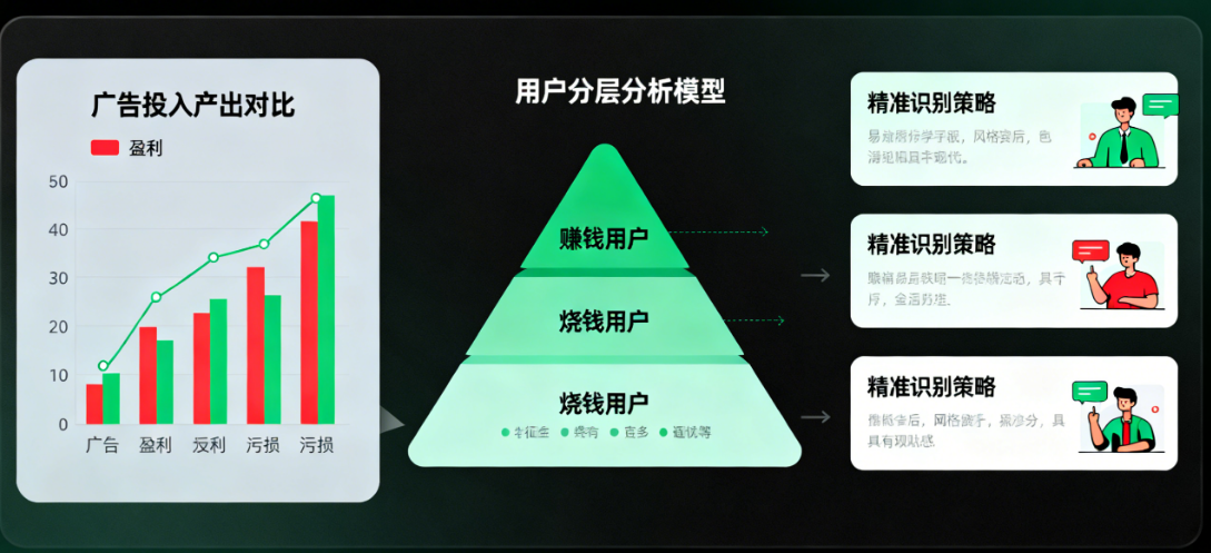 避免“烧钱买垃圾流量”:有些渠道点击单价低,但来的用户根本不买,长期价值为0。